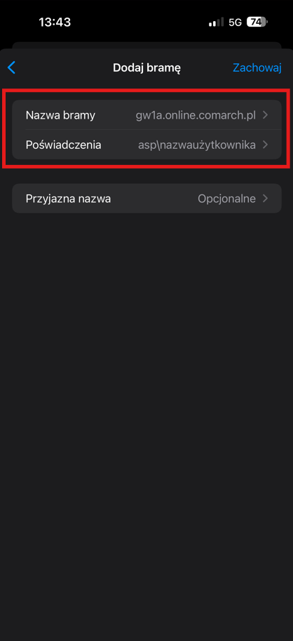 Należy również wprowadzić ustawienia dla Bramy (Gateway), podając adres dla niej (aktualne adresy to: gw1a.online.comarch.pl, gw1b.online.comarch.pl, gw2a.online.comarch.pl lub gw2b.online.comarch.pl). Nie należy zaznaczać opcji Tryb administratora (Admin session). Zmiany należy zapisać przyciskiem” Zachowaj”.