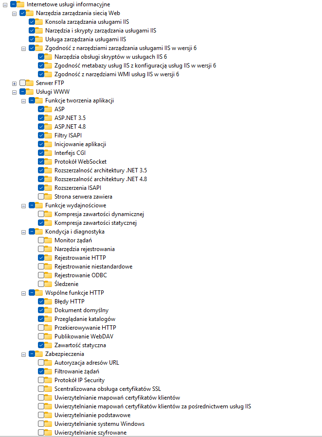 Przed instalacją komponentu POS Agent Broker należy włączyć dodatkowe funkcje systemu Windows – Internetowe usługi informacyjne (IIS). W tym celu należy przejść do Panelu sterowania → Programy i funkcje → Włącz lub wyłącz funkcje systemu Windows → Internetowe usługi informacyjne (IIS) i włączyć: