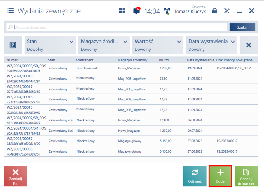 - [Dodaj] – umożliwia dodanie nowego dokumentu WZ