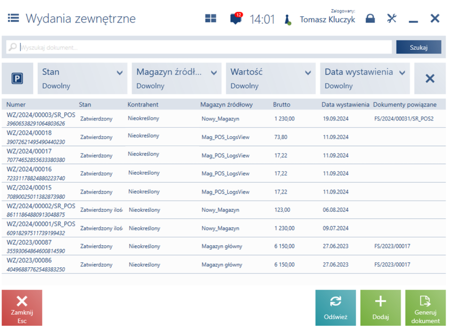 Wydania zewnętrzne to dokumenty magazynowe potwierdzające wydanie towaru na zewnątrz (Klientowi). Zatwierdzanie dokumentu wydania powoduję zmniejszenie ilości zasobów i wartości magazynu.