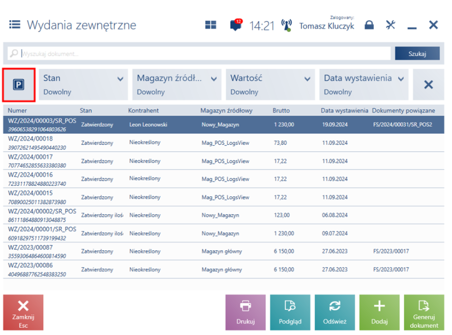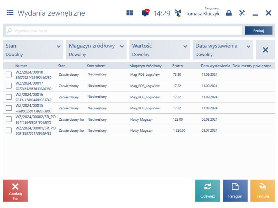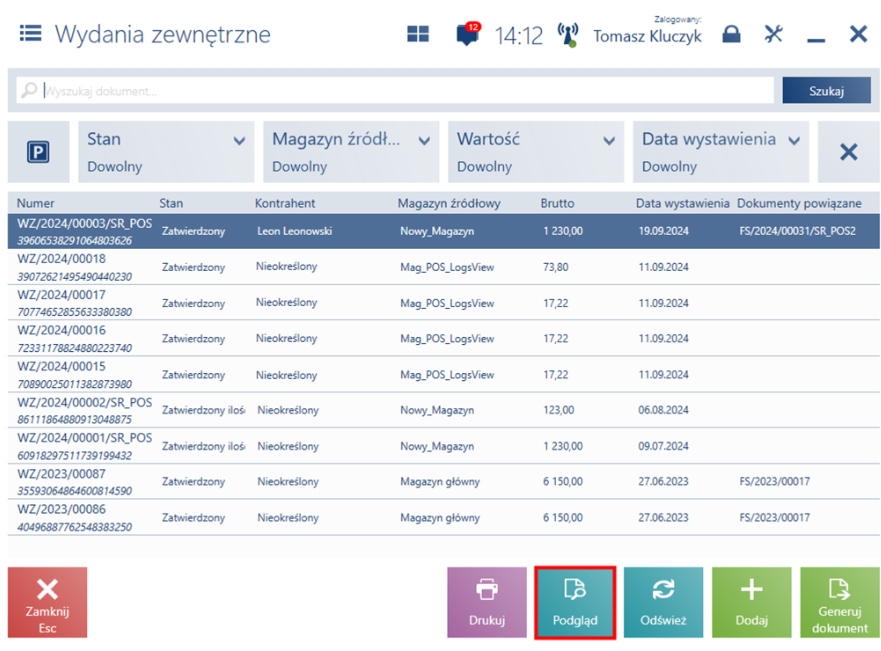 W celu podglądu dokumentu wydania zewnętrznego na stanowisku POS, należy z poziomu listy wydań zewnętrznych wybrać przycisk [Podgląd].