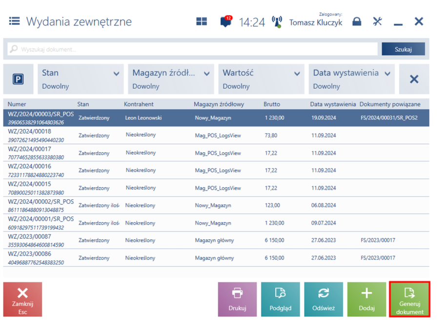Na liście dokumentów WZ dostępny jest przycisk [Generuj dokument]. Po wyborze lista przełącza się w tryb wielokrotnego wyboru, gdzie można wskazać dokumenty WZ do których tworzony będzie zbiorczy dokument sprzedaży lub pojedynczy dokument do jednej WZ.