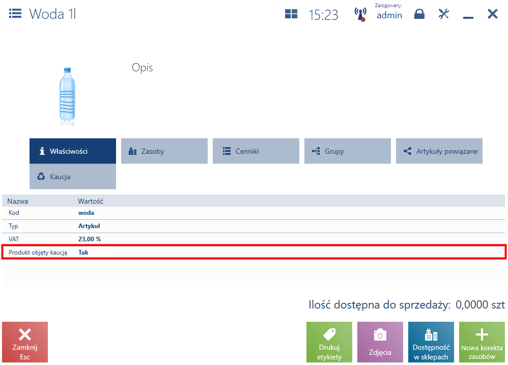 - zakładka Kaucje prezentującą informacje o powiązanej kaucji w podglądzie artykułu oraz jednostce opakowania zwrotnego