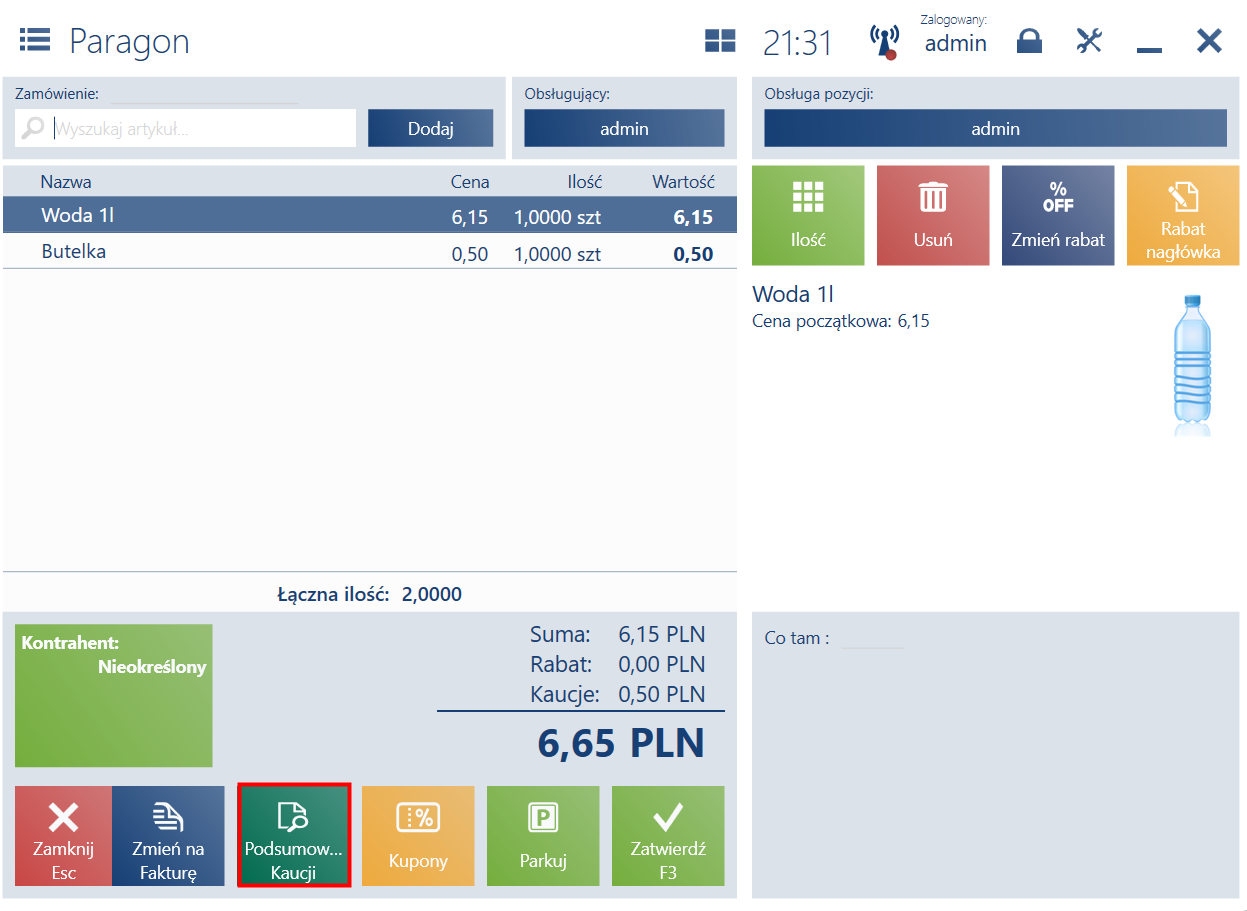 - przy sprzedaży opakowań objętych systemem kaucyjnym, na stanowisku generowany jest odpowiedni dokument kaucji (wydanie kaucji – WKA).