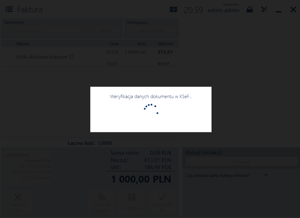 Po poprawnej weryfikacji faktury następuje uwierzytelnianie na platformie KSeF. POS przekazuje numer identyfikacji i token do komponentu w celu uwierzytelnienia w KSeF.