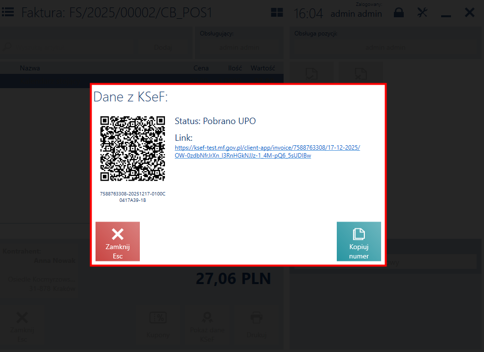 - przyciski [Zamknij] i [Kopiuj numer KSeF]