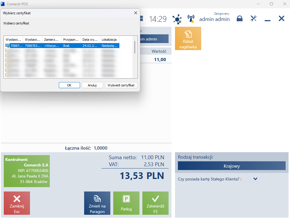 Obecnie, gdy token uwierzytelniania na bazie Comarch POS jest pusty, wyświetlane jest okno do wyboru certyfikatu kwalifikowanego. Jeżeli token jest pusty, należy zweryfikować, czy dostępny jest certyfikat uwierzytelniający KSeF.