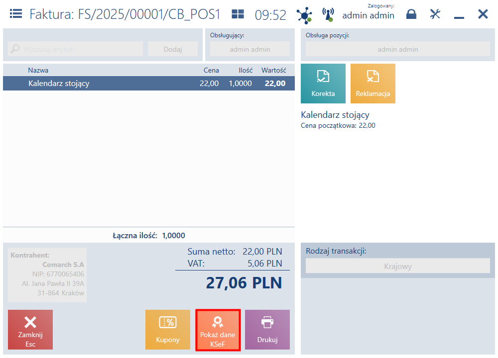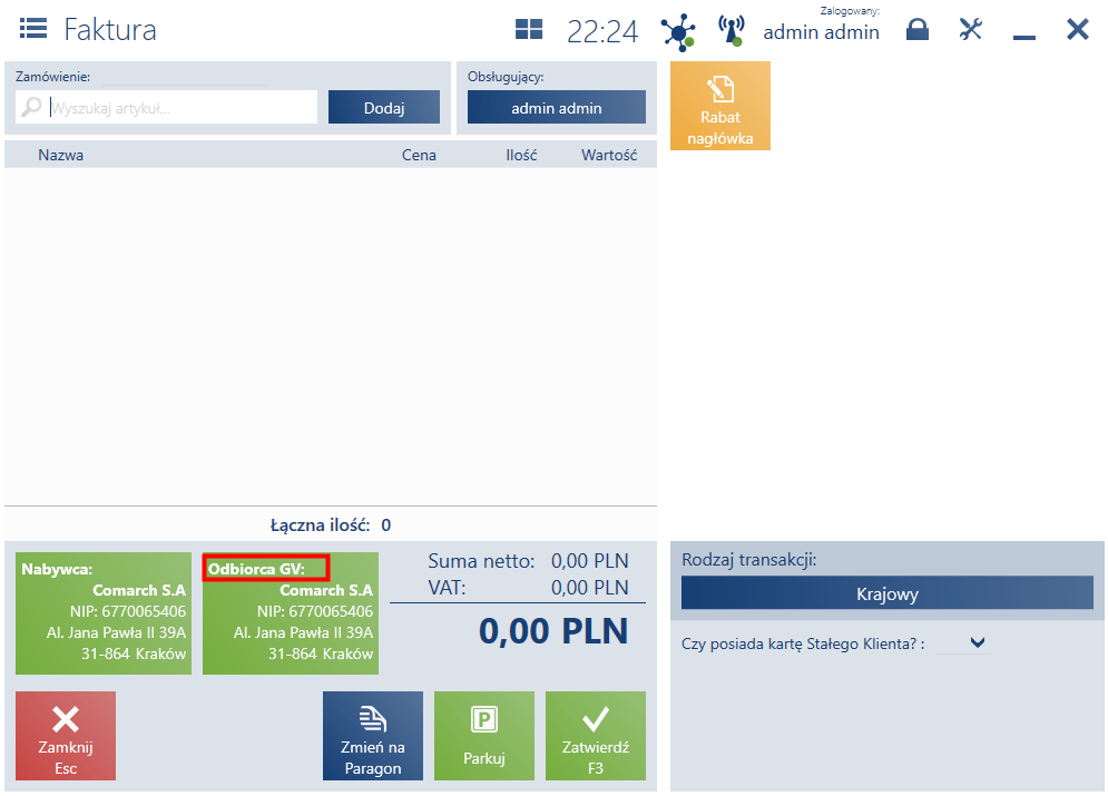W przypadku wystawiania faktur dla instytucji lub dużych podmiotów, które korzystają z Krajowego Systemu e-Faktur (KSeF) w ramach podległych jednostek (np. gmina i jej szkoły, lub Grupa VAT i jej członkowie), wymagane jest określenie odbiorcy dodatkowego w związku z tymi wymaganiami na stanowisku POS wybierając dla nabywcy odbiorcę dostępny jest nowy przycisk [Zmień rolę].
