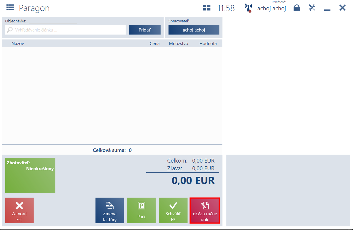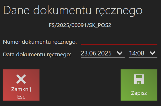 - Nowe okno Dokumenty niezarejestrowane CHDU – w przypadku awarii lub tymczasowej niedostępności CHDU, gdy dokument nie otrzymał OKP, istnieje możliwość wystawienia dokumentu zakupu sporządzonego ręcznie w formie papierowej, a następnie po usunięciu awarii dokumenty te powinny zostać zarejestrowane w aplikacji Comarch POS za pomocą nowego przycisku [Dokument ręczny eKasa] (przycisk dostępny z poziomu formularza paragonu, faktury sprzedaży, korekty do paragonu/faktury i korekty ręcznej). Dla takich dokumentów wprowadzono nowe pola: Numer dokumentu ręcznego i Data dokumentu ręcznego. Pola dostępne są do uzupełnienia po wybraniu na liście nowego przycisku [Zmień dane] i są one obowiązkowe do uzupełnienia.