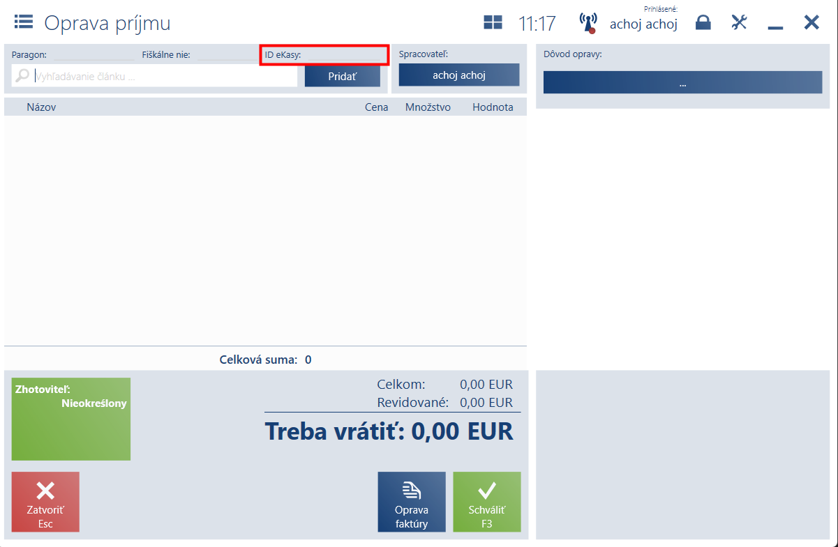- Nowe pole Identyfikator eKasa na korekcie ręcznej – użytkownik może wprowadzić identyfikator korygowanego dokumentu OKP (dla dokumentu nieprzesłanego do eKasa) lub UID (dla dokumentu przesłanego do eKasa). Jeżeli w oknie płatności korekty ręcznej operator wybierze metodę płatności obsługiwaną przez eKasa (czyli inną niż płatność typu Bank) i nie zostanie wprowadzony identyfikator eKasa to podczas zatwierdzania na stanowisku POS zostanie wyświetlony odpowiedni komunikat blokujący, który informuje o tym, że nie można wystawić korekty bez identyfikatora eKasa.