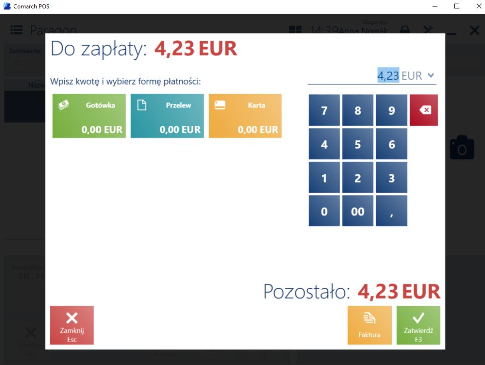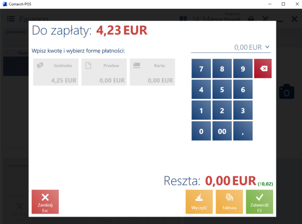 Po wybraniu formy płatności Gotówka system automatycznie zaokrągla wartość dokumentu do kwoty 4,25 EUR. Dodatkowo w prawym dolnym rogu, przy polu Reszta, widnieje symbol strzałki z odpowiednim kierunkiem, informującym o zaokrągleniu: