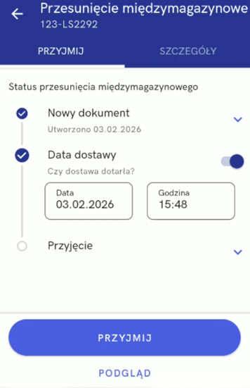 Status W toku oznacza, że przyjęcie dostawy zostało rozpoczęte, natomiast status Zakończone informuje o zakończeniu procesu – zarówno w przypadku pełnego przyjęcia towaru, jak i w sytuacji ręcznego zamknięcia dokumentu przez użytkownika, nawet jeśli nie wszystkie pozycje zostały przyjęte.