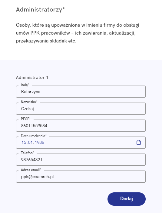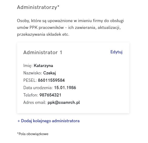 Kolejno należy dodać Administratorów, czyli osoby które są upoważnione w imieniu firmy do obsługi umów PPK pracowników – ich zawierania, aktualizacji, przekazywania składek.