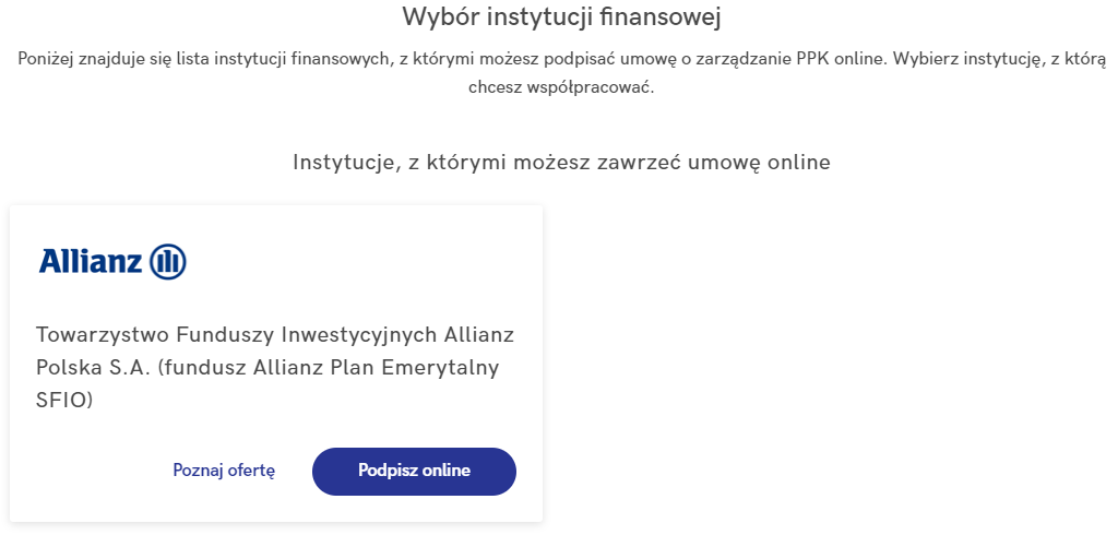 Po wybraniu opcji Podpisz online na kafelku Towarzystwo Funduszy Inwestycyjnych Allianz Polska S.A. (fundusz Allianz Plan Emerytalny SFIO) pojawi się formularz umowy o zarządzanie PPK.