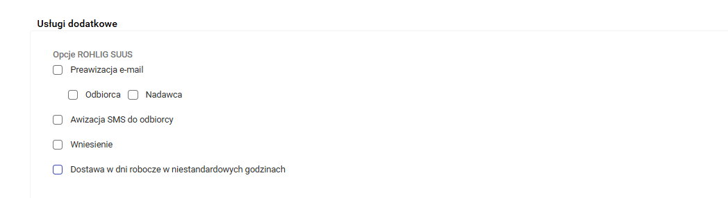 - Usługi dodatkowe – dostępność usług dodatkowych uzależniona jest od wybranego rodzaju odbiorcy. Udostępnione zostały następujące opcje: