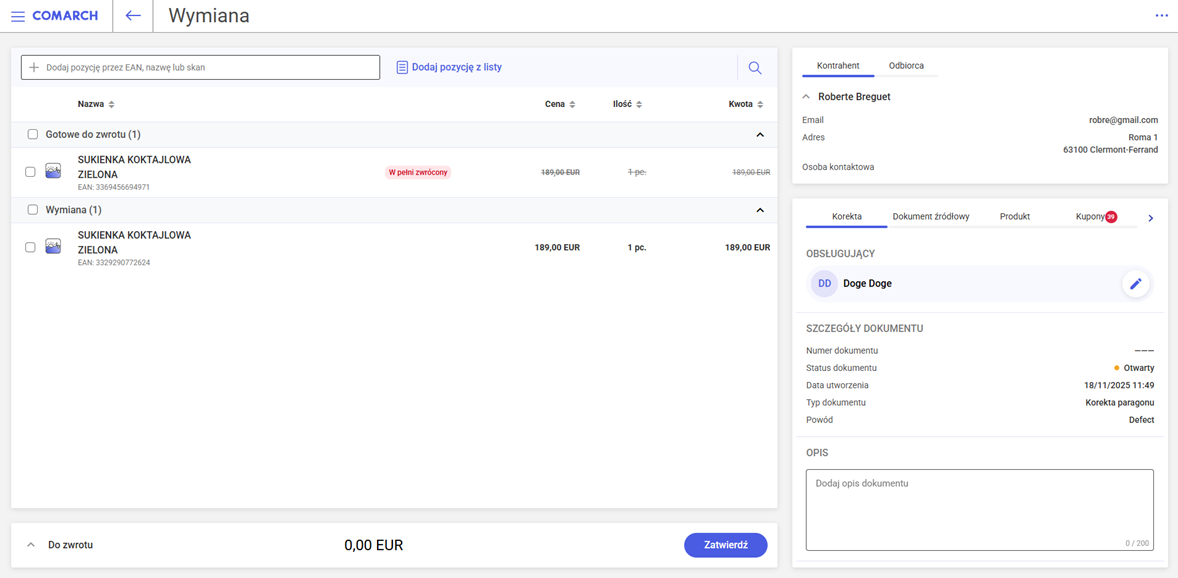 Kolejność tych działań nie jest narzucona – użytkownik może najpierw dodać nowy produkt do dokumentu, a dopiero później wskazać pozycje przeznaczone do zwrotu, lub odwrotnie.