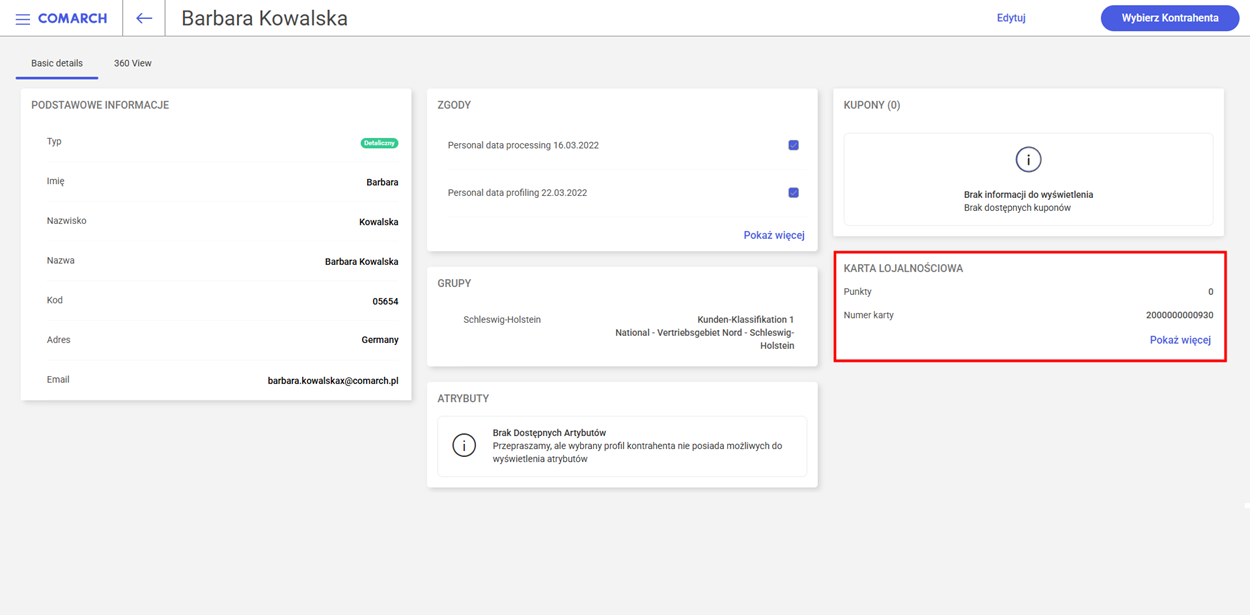 • przypisania nowej karty lojalnościowej do kontrahenta,