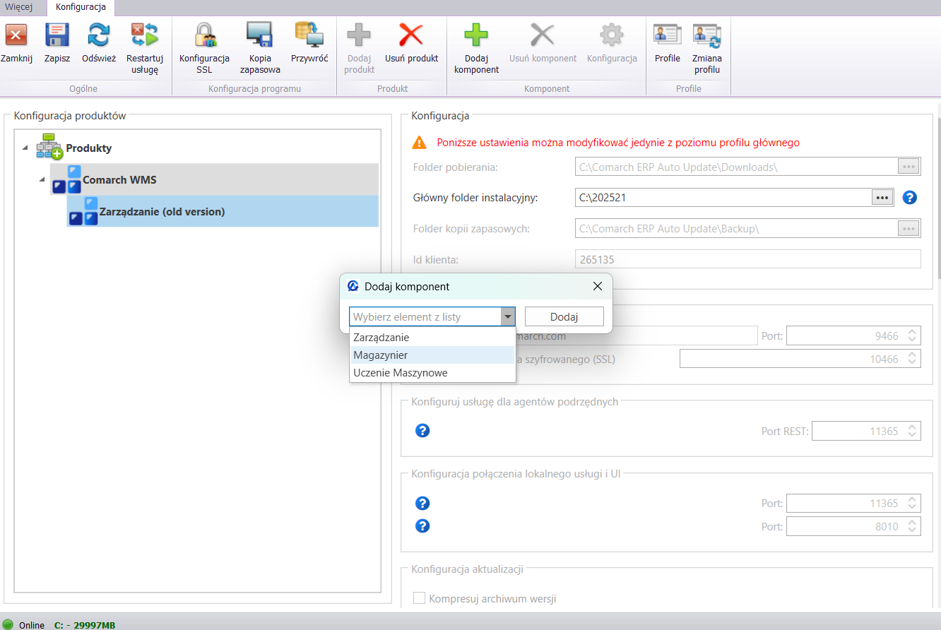 Jeżeli użytkownik po zainstalowaniu Comarch ERP Auto Update pominął krok z prekonfiguracją lub nie wybrał na tym oknie opcji: [Konfiguruj jako: Comarch WMS], wówczas, do drzewa produktów w Konfiguracji Comarch ERP Auto Update, należy ręcznie dodać produkt Comarch WMS. W tym celu należy wybrać opcję: [Dodaj produkt] oraz z rozwijalnej listy wskazać Comarch WMS.