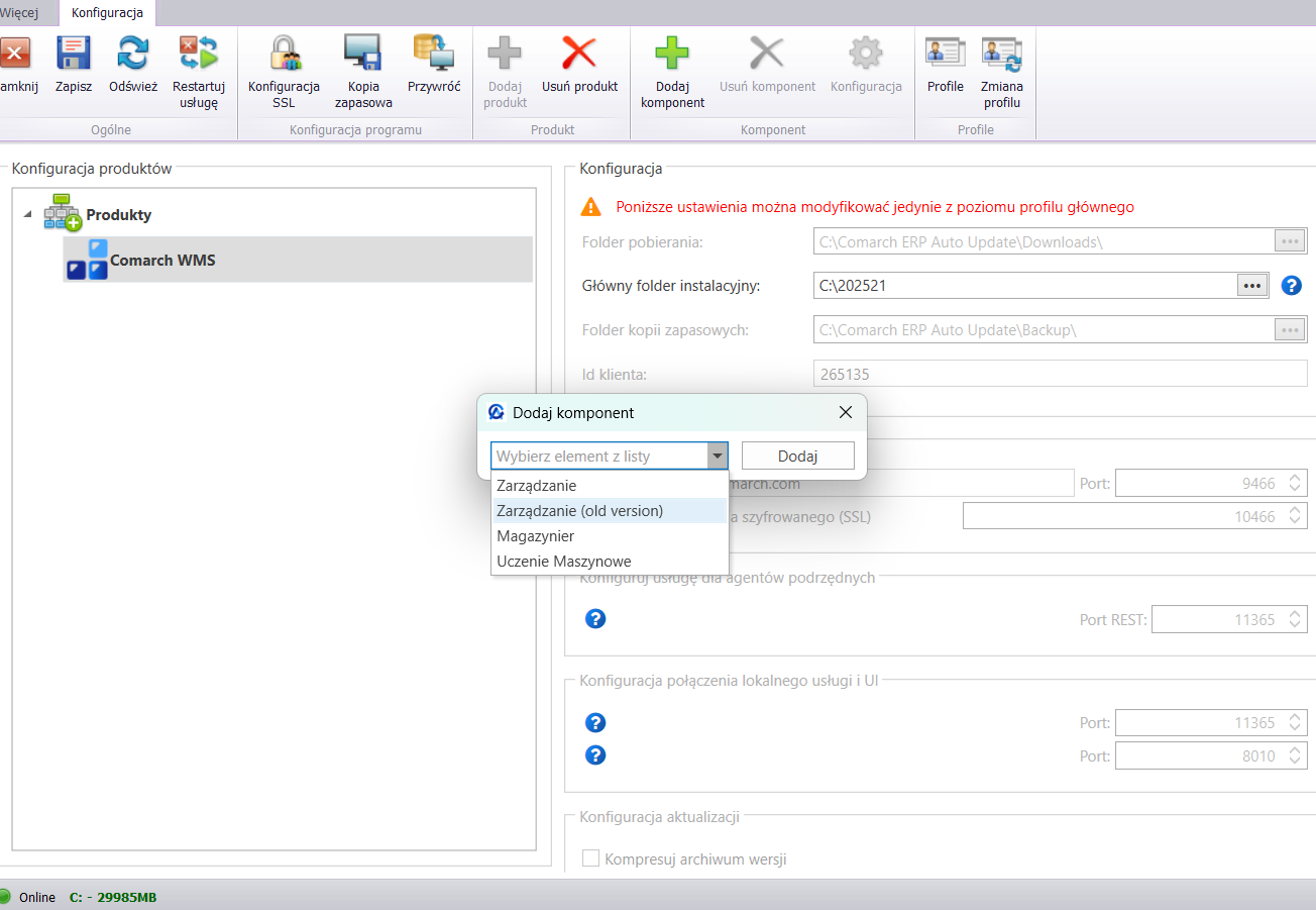 Możliwość instalacji komponentu Zarządzanie dostępne jest od wersji Comarch WMS 2025.2.1. Tym samym do wersji Comarch WMS 2025.1 należy konfigurować / instalować komponent Zarządzanie (old version).