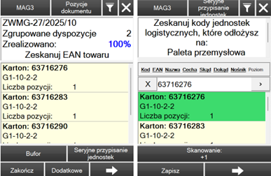 Jednostki, które są gotowe do zagnieżdżenia zostają przekazane do filtra Bufor, z którego istnieje możliwość wywołania akcji seryjnego przypisania jednostek. Po wywołaniu akcji, dochodzi do utworzenia nowej jednostki logistycznej, na którą będą odkładane pozostałe nośniki. Gdy użytkownik zeskanuje określone kody jednostek, będzie miał możliwość odłożenia nośnika nadrzędnego (a tym samym nośników które się na niej znajdują) na położenie docelowe lub zapisanie jednostki do Bufora, gdzie operator będzie mógł ponownie wywołać akcję seryjnego przypisania jednostek.