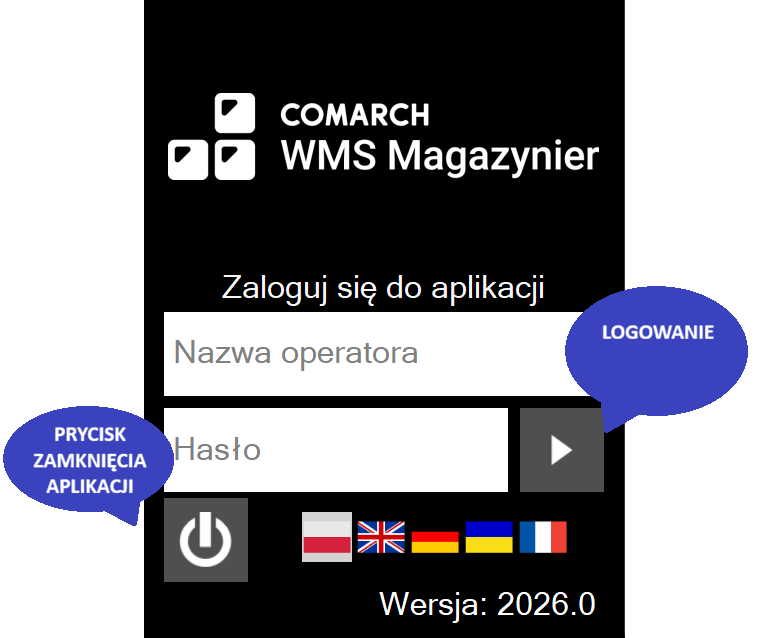 Po uruchomieniu aplikacji Comarch WMS Magazynier zostanie wyświetlone okno logowania.
