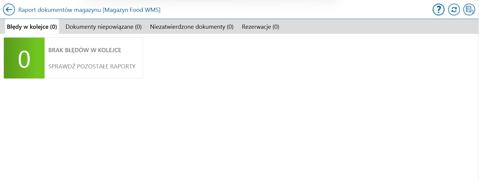 Zakładki raportu aktualizują się dynamicznie, z wyjątkiem zakładki Dokumenty niepowiązane. Należy odświeżyć raport za pomocą ikony . W zakładce Dokumenty niepowiązane wyświetlone zostaną dokumenty dotyczące wszystkich magazynów zbiorczych. W sytuacji, gdy po przejściu do zakładki Dokumenty niepowiązane wygenerują się tylko dokumenty np. dla jednego magazynu z dwóch składowych, na zakładce Dokumenty niepowiązane wyświetlona zostanie informacja o tym, że dokumenty dla drugiego z magazynów są aktualnie generowane.