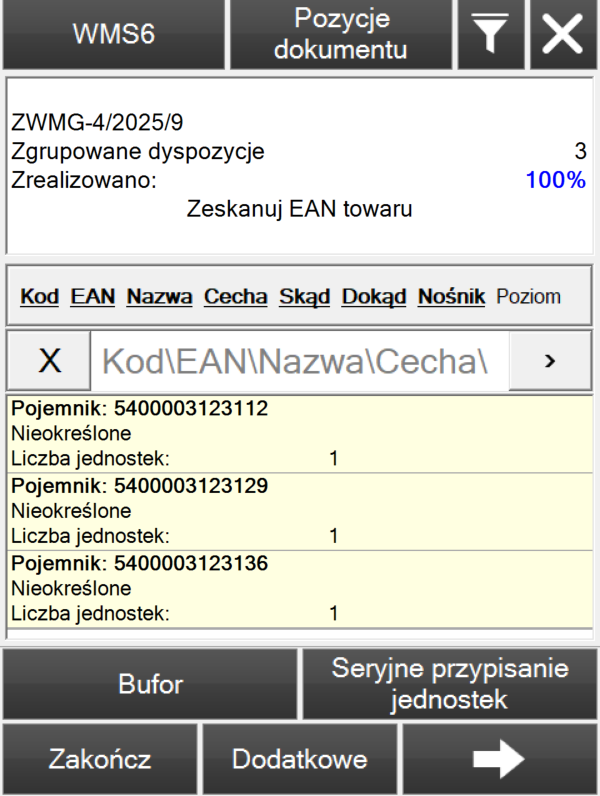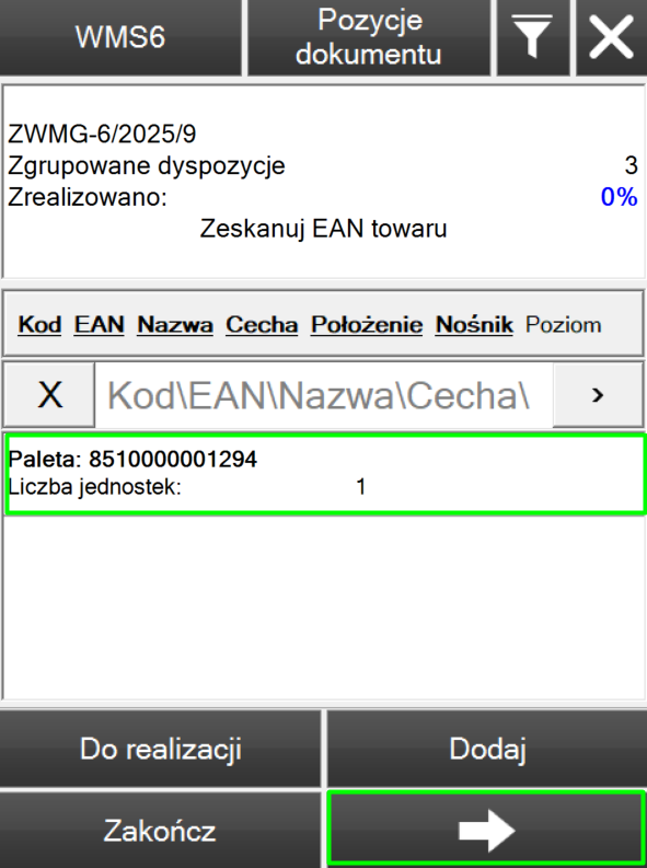 Będąc na liście pozycji drugiego etapu zgrupowanej dyspozycji ZWMG [2/2], możliwe jest bezpośrednio zeskanowanie kodu znajdującej się na liście jednostki logistycznej. Spowoduje to jej automatyczną realizację, bez konieczności realizacji wyżej opisanych kroków 2 etapu.