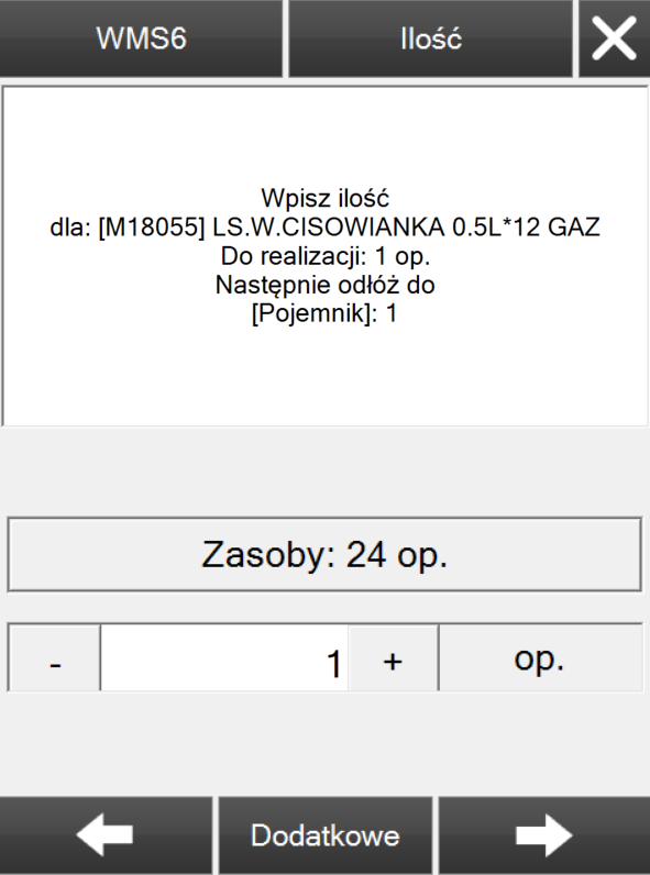 Po zatwierdzeniu typu jednostki logistycznej, należy wybrać ilość jaka ma znaleźć się na zdefiniowanej jednostce logistycznej. Docelowo ustawiona zostaje ilość widniejąca na pierwszej skompletowanej dyspozycji dla danego towaru.