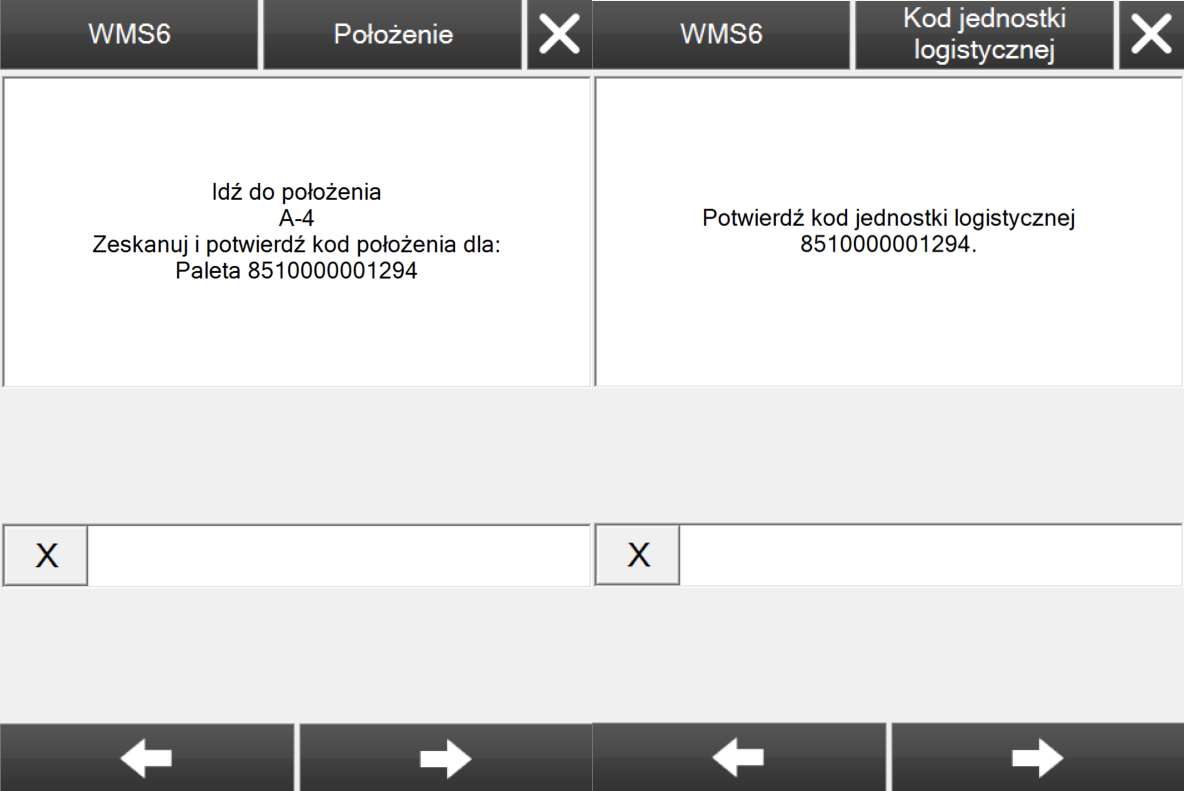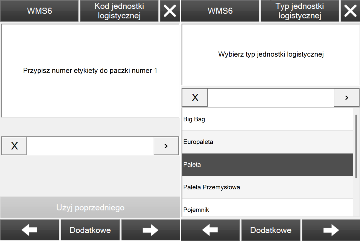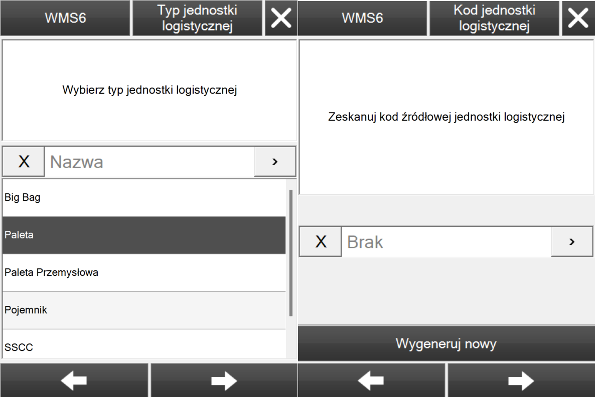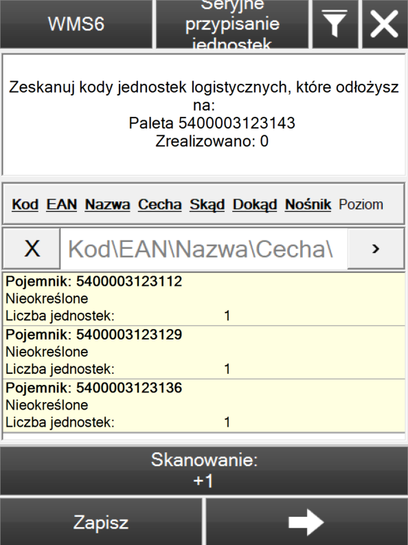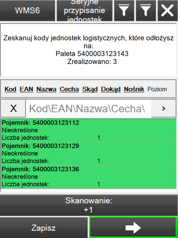 Po zeskanowaniu kodów jednostek logistycznych, które mają trafić na większą jednostkę logistyczną po wybraniu przycisku strzałki w prawo, mniejsze jednostki zostaną odłożone na większą jednostkę logistyczną.
