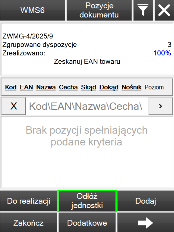 Po wykonaniu pozycji na dokumencie należy wybrać przycisk „Odłóż jednostki”.
