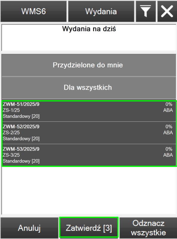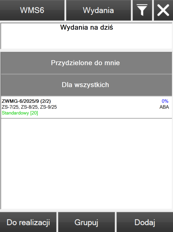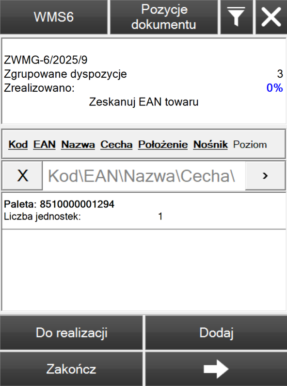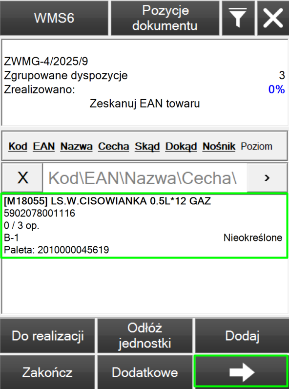 Po zatwierdzeniu dyspozycji powstaje dokument ZWMG zawierający zbiór wszystkich towarów z wybranych wcześniej dyspozycji. W przypadku występowania takich samych pozycji, zostaną one zagregowane do 1 pozycji (zaznaczony parametr „Łączenie pozycji” w konfiguracji procesu). Realizacja pozycji na dokumencie odbywa się poprzez wybranie jednego z towarów z listy lub klikniecie przycisku strzałki co spowoduje rozpoczęcie realizacji pierwszej pozycji na liście.