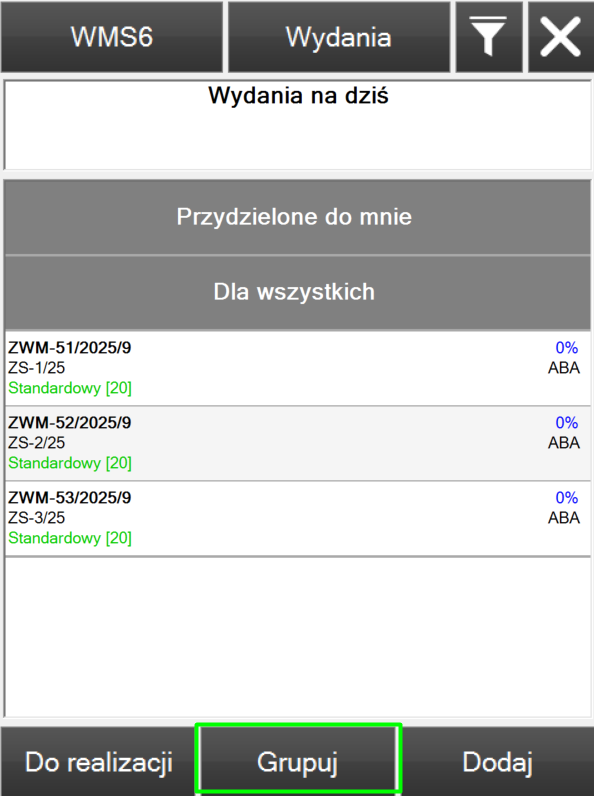 W celu rozpoczęcia procesu kompletacji w Comarch WMS Magazynier należy na liście wyboru dyspozycji wydań wybrać przycisk „Grupuj”.