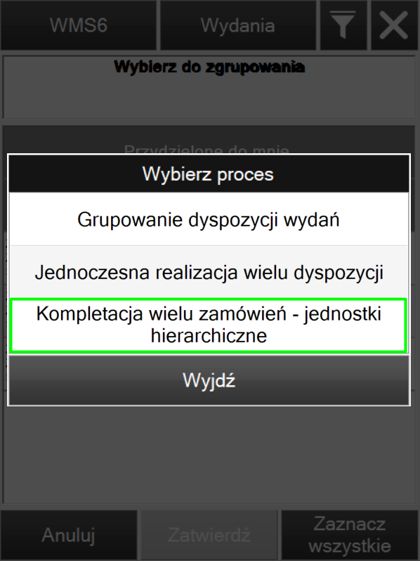 Po pojawieniu się okna z wyborem realizacji procesu należy wybrać „Kompletacja wielu zamówień – jednostki hierarchiczne”.