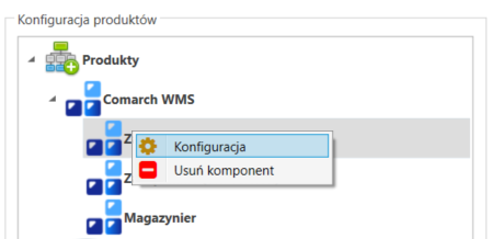 Aby skonfigurować komponent Comarch WMS Zarządzanie należy nacisnąć prawym przyciskiem myszy na komponencie i wybrać opcję [Konfiguracja].