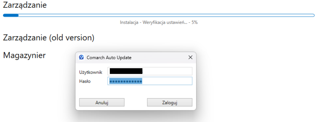 Po wybraniu tej opcji nastąpi pobranie nowej wersji aplikacji Comarch WMS Zarządzanie z serwera Comarch, a następnie program Comarch ERP Auto Update przystąpi do jej instalacji. Pojawi się następujący komunikat: