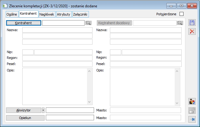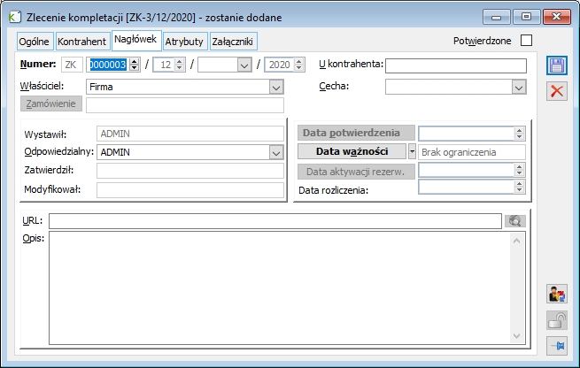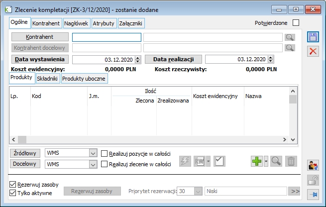 Koszt ewidencyjny– W przypadku kompletacji, koszt ten określa ewidencyjny koszt dla produktu, który ma być uzyskany. Podpowiadany jest podobnie jak ilość na zleceniu. W przypadku dekompletacji, koszt ten nie jest istotny, gdyż to składniki „są produkowane” – wtedy istotny jest koszt na nich określany.