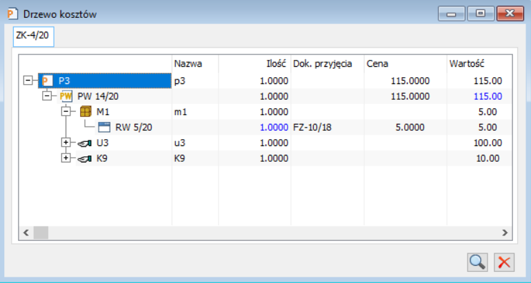 Jeżeli zlecenie jest rozliczone wg kosztów rzeczywistych, a operator nie ma zablokowanego dostępu do jego kosztów, z okna: Rejestr zleceń, może uruchomić okno pokazujące drzewo kosztów.