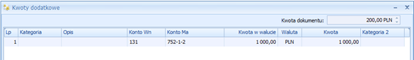 , który pozwala na przypisanie kwot dodatkowych. Każda kwota dodatkowa może zawierać następujące informacje: kategoria, konto Wn, konto Ma oraz Kwota.