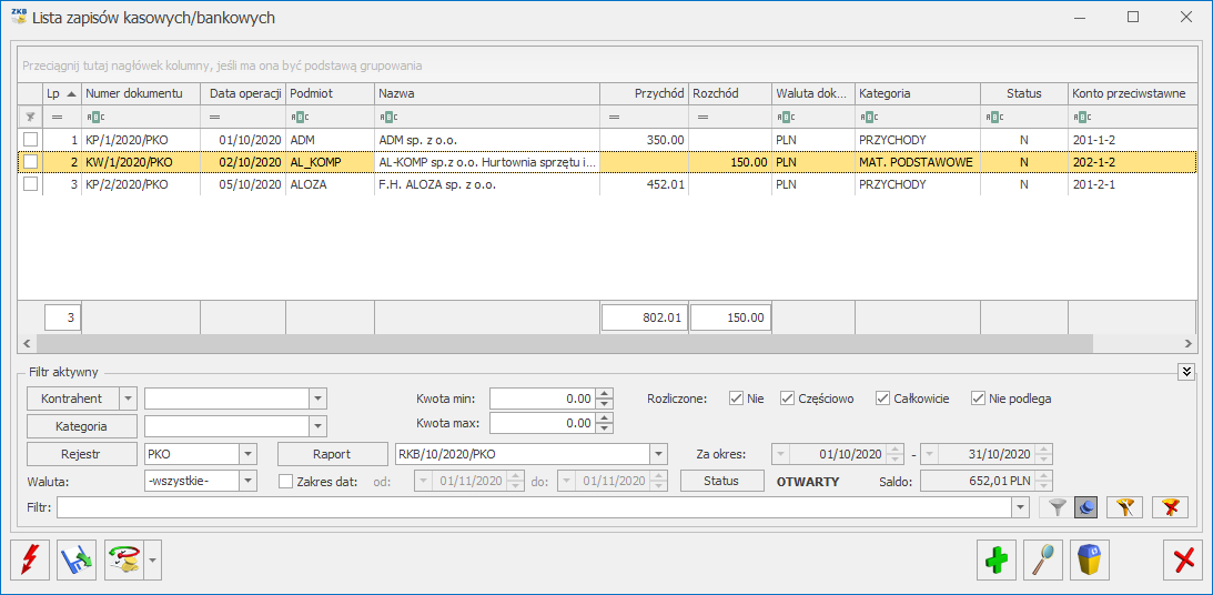 Lista zapisów kasowych/bankowych