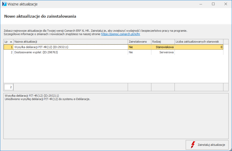 Jeżeli aktualizacje zostały pobrane, otwierana jest ich lista z informacjami o: numerze kolejnym aktualizacji, nazwie aktualizacji, czy aktualizacja została zainstalowana (Tak / Nie), rodzajem aktualizacji (Stanowiskowa / Serwerowa) oraz liczbą zaktualizowanych stanowisk (dla aktualizacji stanowiskowej):