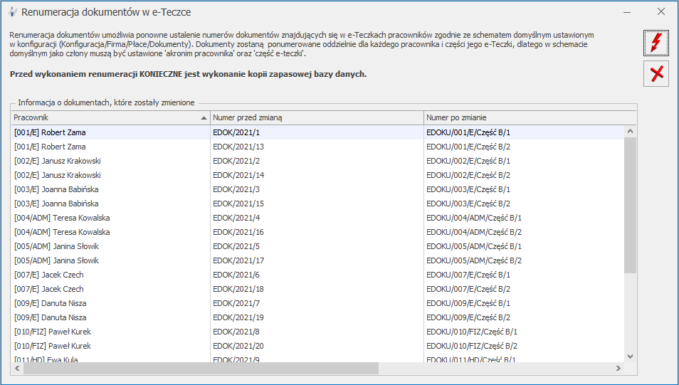 W zakładce Narzędzia > Korekty danych została dodana nowa funkcja Renumeracja dokumentów w e-Teczce, która umożliwia przenumerowanie wprowadzonych wcześniej dokumentów w e‑Teczkach zgodnie ze schematem, który jest ustawiony jako domyślny dla e-Teczki w konfiguracji [System/konfiguracja/Firma/Płace/Dokumenty]. Renumeracja jest możliwa jedynie, gdy schemat domyślny umożliwia numerowanie dokumentów w obrębie pracownika i części e-Teczki. Przed wykonaniem renumeracji należy wykonać kopię zapasową bazy danych. Renumeracja spowoduje ponowne ustawienie numerów dokumentów znajdujących się w poszczególnych częściach e-Teczki danego pracownika. Numerowanie wykona się oddzielnie dla każdego pracownika i jeszcze dodatkowo w obrębie jego części e-Teczki. Numer bez zer lub z zerami w pełnym numerze dokumentu dla dokumentu znajdującego się w danej części e-Teczki pracownika zostanie ustalony na podstawie daty dodania dokumentu (pole PRT_TS_Zal w tabeli CDN.PracTeczki). Jeśli w numerze dokumentu jest wykorzystywana seria należy ją dodać w konfiguracji definicji dokumentów (Konfiguracja/Firma/Definicje dokumentów/Płace/Serie dokumentów) i ustawić jako domyślną w konfiguracji dokumentów płacowych (Konfiguracja/Firma/Płace/Dokumenty).