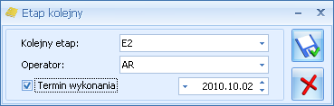 Po przypisaniu schematu do dokumentu w tabeli Etap bieżący pojawia się pierwszy etap procesu. Jeśli do tego etapu przypisany jest operator aktualnie zalogowany (System/ Konfiguracja/ Program/ Obieg dokumentów/ Etapy: zakładka [Operatorzy]) to automatycznie jest on proponowany jako osoba odpowiedzialna za jego wykonanie. Jeśli etap ten ma być wykonany przez innego operatora – można go zmienić na formularzu etapu, po wciśnięciu