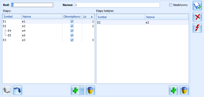 - etap powiązany nie może mieć zaznaczonej opcji obowiązkowy (usuwane mogą być tylko etapy powiązane nieobowiązkowe).