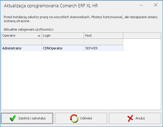 • Zamknij i zainstaluj – powoduje zamknięcie połączeń do baz danych programu Comarch ERP XL HR i rozpoczęcie procesu aktualizacji,