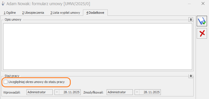 W związku z tym na formularzu umowy cywilnoprawnej, na zakładce [Dodatkowe] oraz na formularzu umowy B2B został dodany parametr: Uwzględniaj okres umowy do stażu pracy. Okres pracy na umowie cywilnoprawnej oraz umowie B2B w danej firmie będzie traktowany jako staż w firmie.