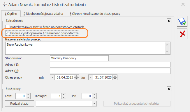 Podczas naliczania stażu na potrzeby ustalania limitu nieobecności czy dodatków stażowych uwzględniane będą umowy cywilnoprawne, które były wykonywane w danej firmie i mają zaznaczony parametr Uwzględniaj okres umowy do stażu pracy lub okresy wprowadzone w historii zatrudnienia, które mają zaznaczony parametr Umowa cywilnoprawna/działalność gospodarcza.