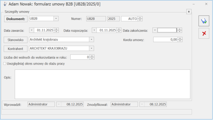 Na formularzu umowy B2B Użytkownik może określić::