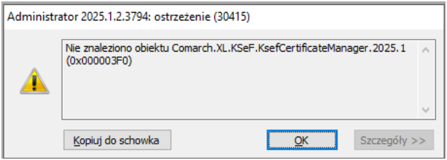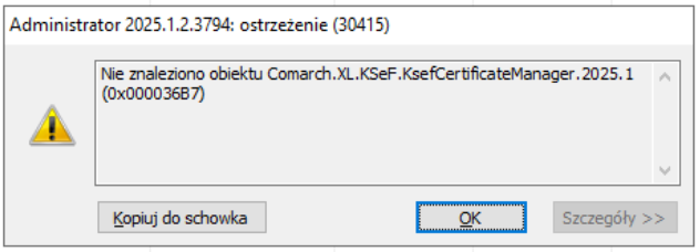 Jeżeli przy próbie generowania certyfikatów pojawia się następujący błąd: Nie znaleziono obiektu Comarch.XL.KSeF.KsefCertificateManager.2025.1 (0x0000036B7)