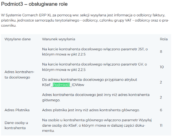 O roli dla Podmiotu 3 decydują następujące warunki: Dla Roli 2 (Odbiorca) – adres kontrahenta docelowego jest inny niż kontrahenta głównego i do adresu kontrahenta docelowego przypisano atrybut KSeF_Podmiot3_IDWew. Dla Roli 6 (Płatnik) – adres płatnika jest inny niż adres kontrahenta głównego