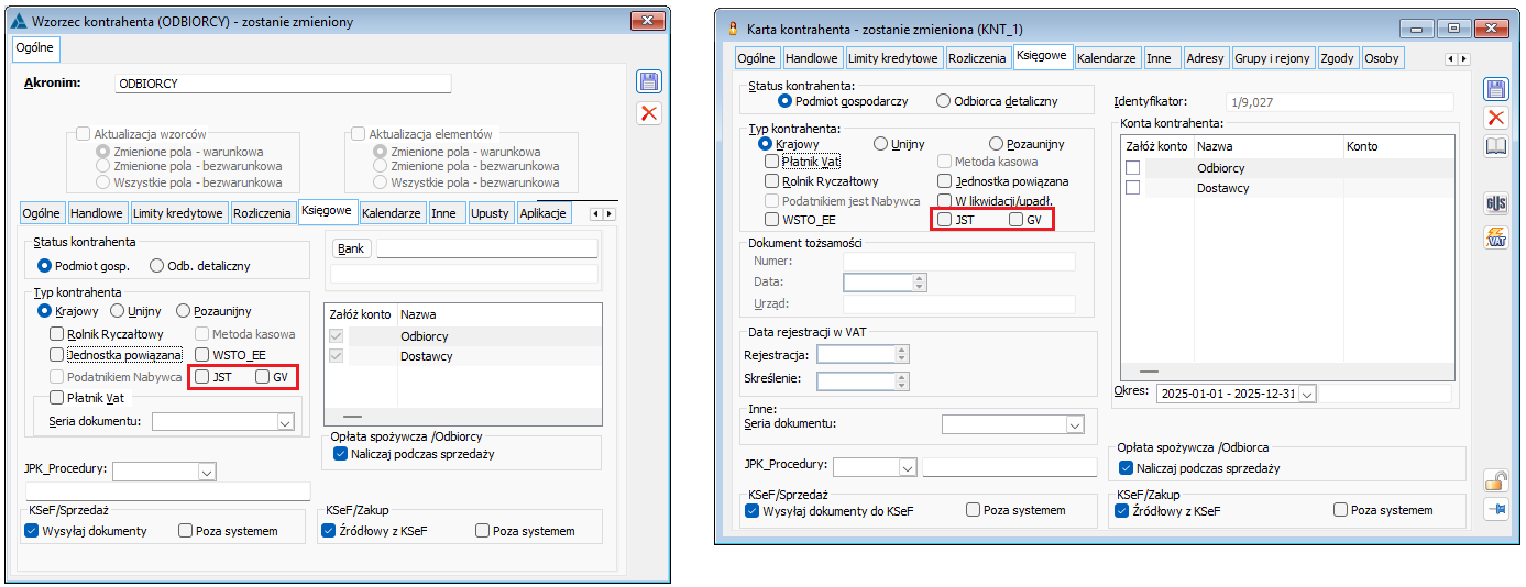 W wersji 2025.1 na formatkę wzorca kontrahenta i kartę kontrahenta dodane zostały parametry: JST – Jednostka podrzędna samorządu terytorialnego oraz GV – Członek grupy VAT.